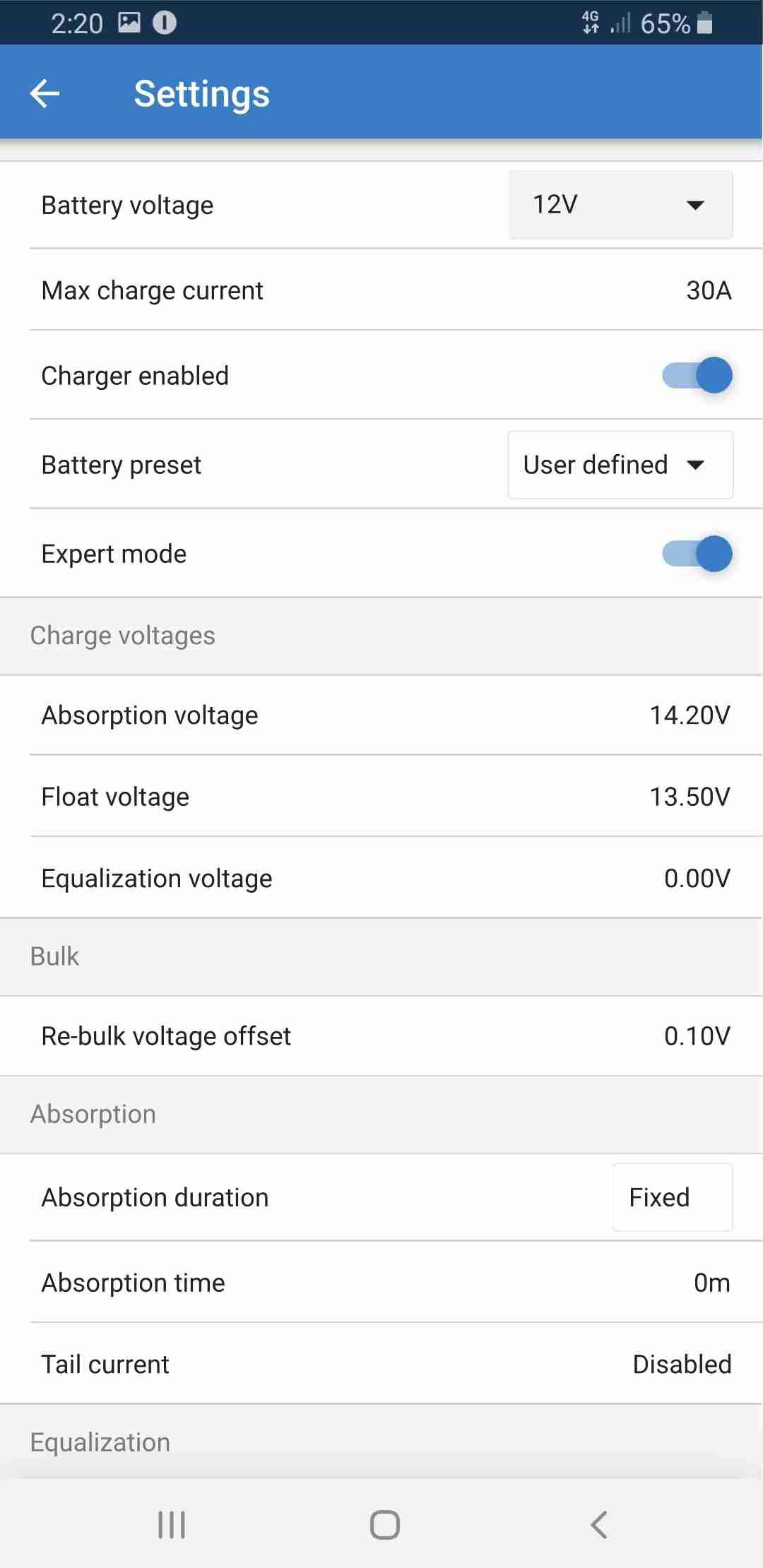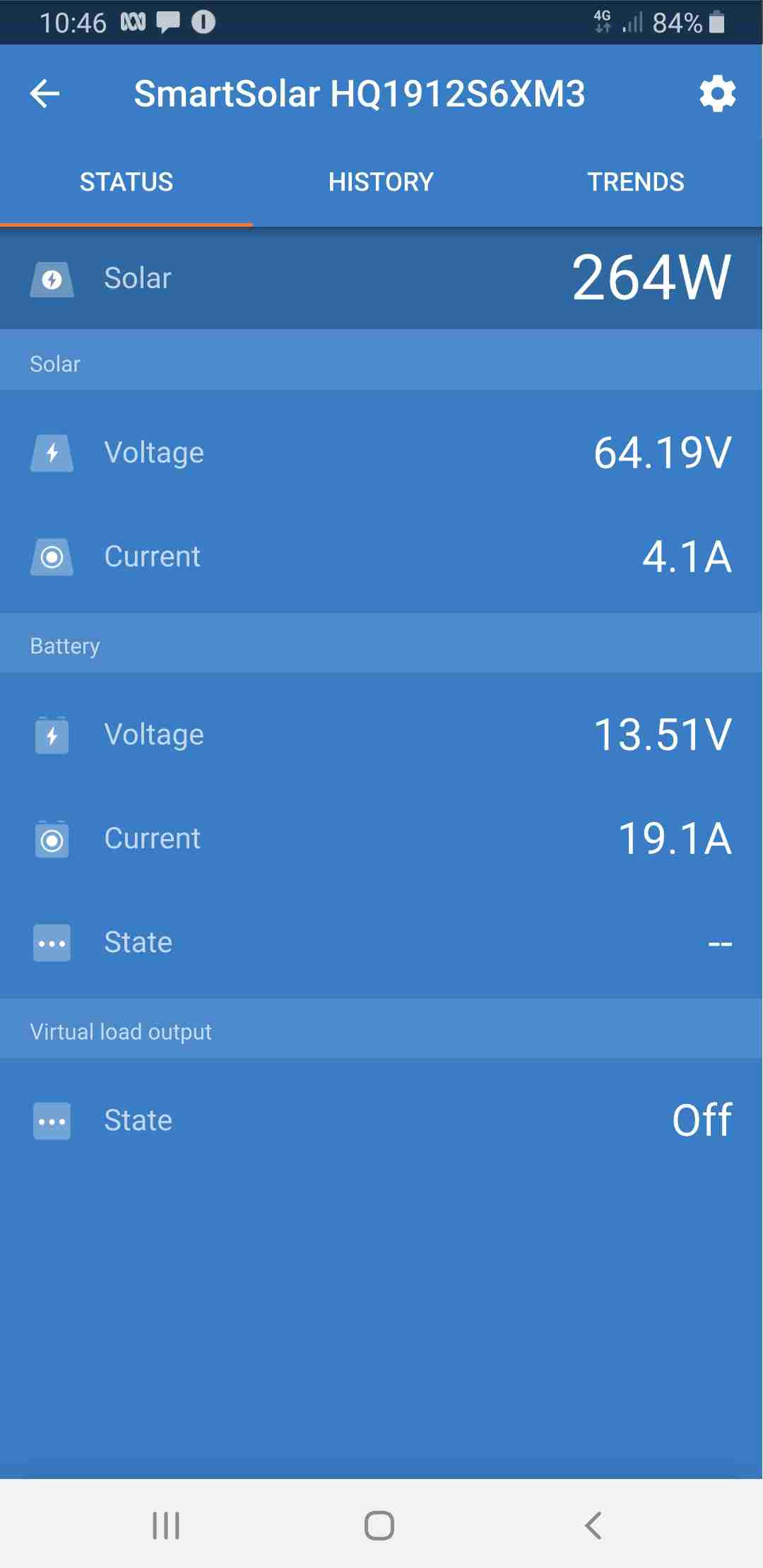 The two panel system consists of two 190 watt 36.5 volt (Pmax) PV panels in series, a Victron Energy Blue power Smart MPPT